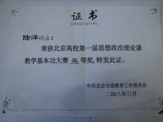 陆洋获北京高校第一届思想政治理论课教学基本功大赛三等奖