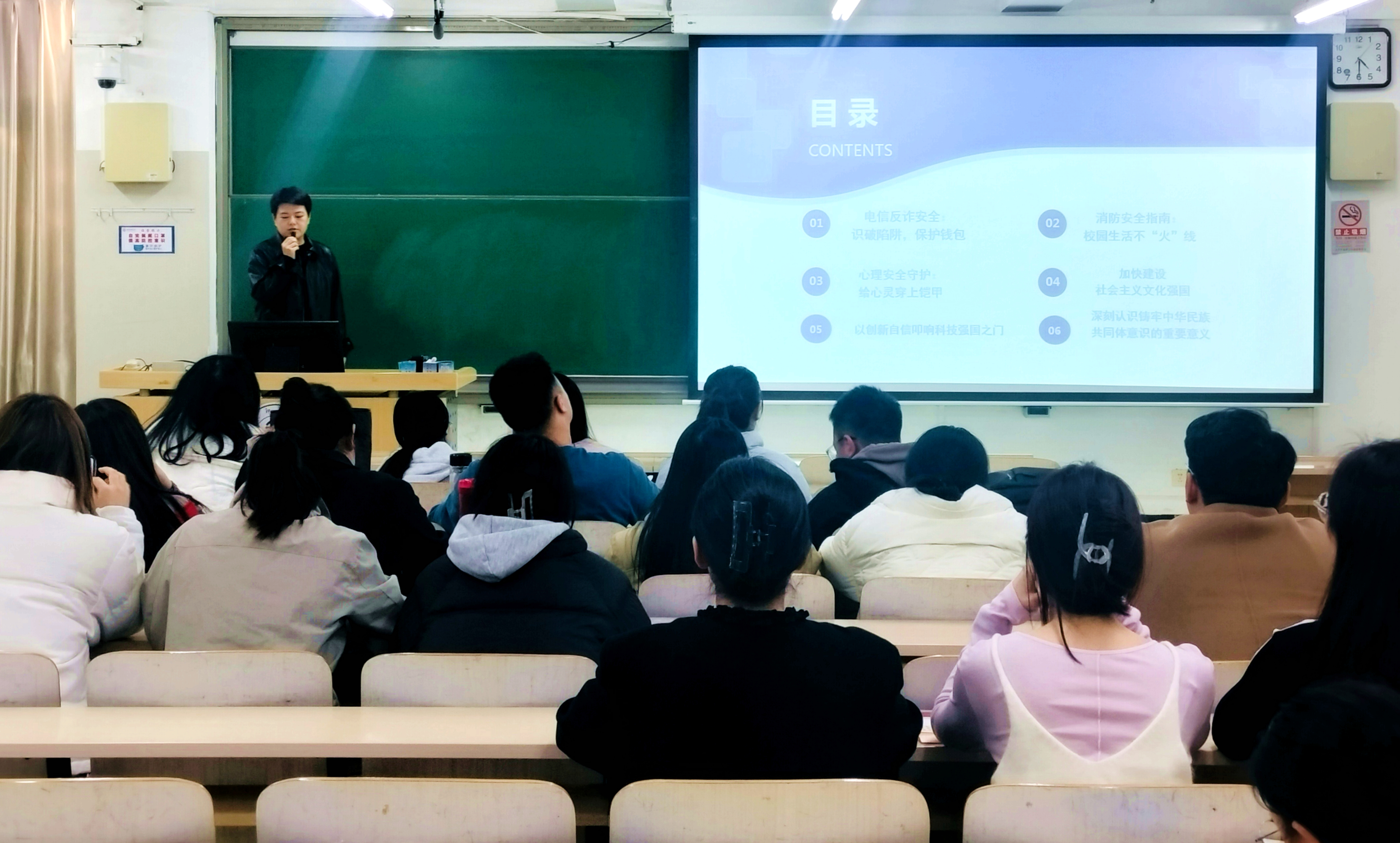 会上,潘泽权围绕校园安全和心理健康教育,从五个维度提出具体要求:一是反诈防骗,守护财产安全。针对“助学贷款还款”“刷单返利”“冒充公检法”等校园高发电信诈骗类型,强调员工需严守“不轻信、不贪心、不慌张、不转账”的“四不”原则,全员安装国家反诈中心APP,遇可疑情况立即拨打96110报警。二是防火禁险,筑牢安全底线。结合近期高校宿舍火灾案例,明确宿舍禁用“小太阳”、电煮锅等高危电器,要求“人走断电”,严禁私拉电线,强化“校园即家园”的责任意识。三是心理赋能,护航健康成长。呼吁员工正视心理问题,遇焦虑、抑郁等情绪时,主动通过辅导员或心理热线(12355)寻求帮助,强调“求助是自我关爱的体现,而非软弱”。四是科技铸魂,厚植文化自信。倡导员工立足“因事而化、因时而进、因势而新”,善用智能工具提升创新能力,以文化自信驱动科技报国,勇攀高峰。五是凝心聚力,共筑民族复兴。深化中华民族共同体意识教育,引导员工自觉抵制错误思潮,增强民族认同感与凝聚力,夯实校园和谐稳定的思想根基。