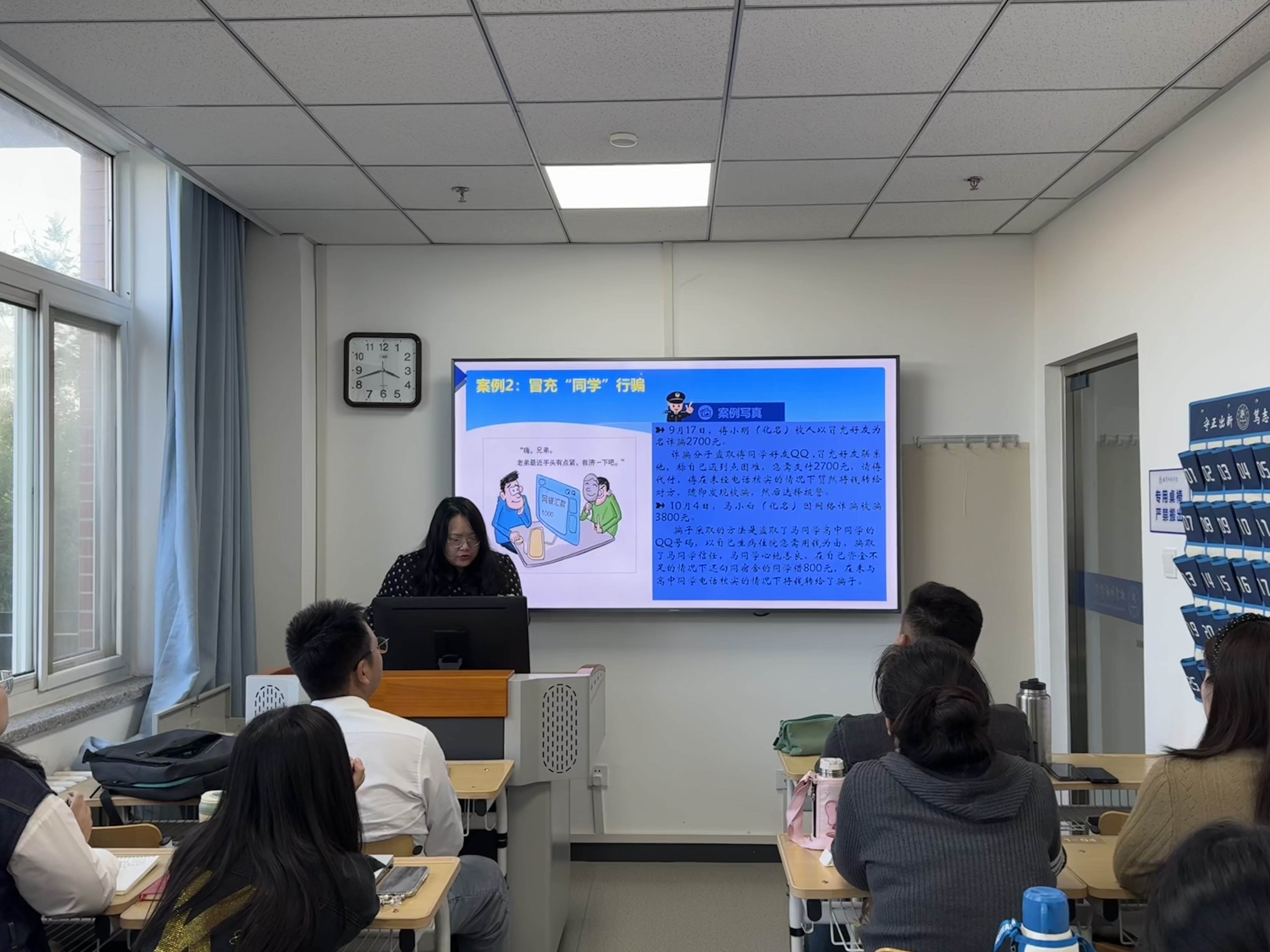 邓笑分别从“电信网络诈骗案例”“电信诈骗的常见骗局”“如何识别防范电信诈骗”等三个方面进行展开,并结合经典案例对网络刷单、兼职诈骗、冒充熟人、校园贷等一些典型的骗术进行了解析,提醒同学们防范电信网络诈骗,从你我做起。她强调,同学们要时刻谨记“防电信诈骗十守则“,积极下载“国家反诈中心”APP,养成健康上网习惯,不给坏人可乘之机。