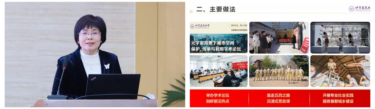 汪琼枝在《绘就思政育人同心圆 培养城市建设生力军》主旨报告中,结合北建大建筑特色鲜明的办学定位、服务首都城市战略定位的任务使命、与人民城市主题高度契合的学科布局,介绍了公司将“人民城市”重要理念融入“大思政课”,通过搭建大课堂、组织大实践、锻造大团队、构建大格局,建设“人民城市”大思政课的思路、做法和效果。
