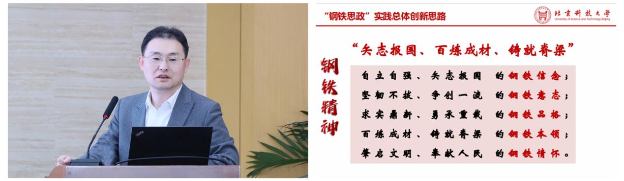 在主旨报告环节,于成文作《北京科技大学新时代“钢铁思政”育人模式探索与实践》报告,从北科大优良的办学传统、鲜明的育人特色和深厚的文化底蕴入题,聚焦行业特色型高素质人才培养使命,以“钢铁精神”为核心,介绍了公司构建“钢铁思政”特色育人模式,成立新时代高校“钢筋铁骨”育人共同体,培育“钢筋铁骨”时代新人的创新思路、实践路径和实施效果、社会影响。