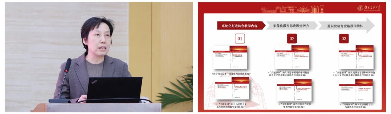 孙冬梅在《统合育人资源 打造“交通强国”大思政课》主旨报告中,从“建好第一课堂,以交通元素打造精品金课,建设好思政课‘关键课程’”“打通第二课堂,以交通强国赋能实践育人,建设思政课实践教学体系”“融入社会大课堂,以交通为名发出交大声音,推进大中小学‘思政课’一体化建设”三方面介绍了北京交通大学“大思政课”建设的思路、举措和成效。
